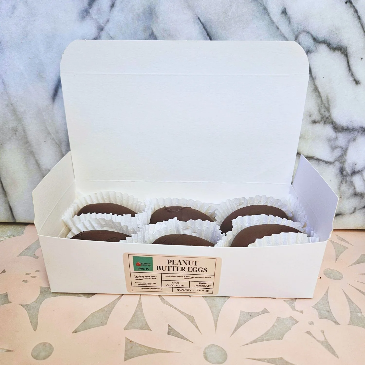Ingredients: Natural Peanut Butter, Confectioner’s Sugar, Milk or Dark Chocolate, Salt